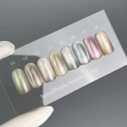 Korean cat eyes are real glass Korean cats designed by the Nailsoftheday team. The effect of porcelain nails, translucent, modern 8 nude shades of gel polish.